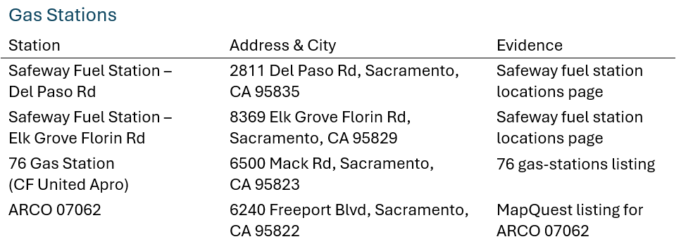 -Search each gas station address (e.g., 2811 Del Paso Rd). When Google drops a pin, click “Add to map”.